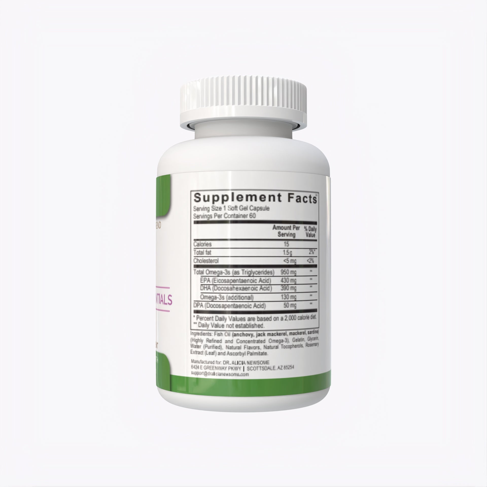 True Omega Essentials by Dr. Alicia Newsome is a high-potency omega-3 fish oil supplement formulated to support cardiovascular health, brain function, joint mobility, and overall wellness. Sourced from wild-caught, cold-water fish, this ultra-pure formula provides optimal concentrations of EPA and DHA, the two most essential omega-3 fatty acids for the body.